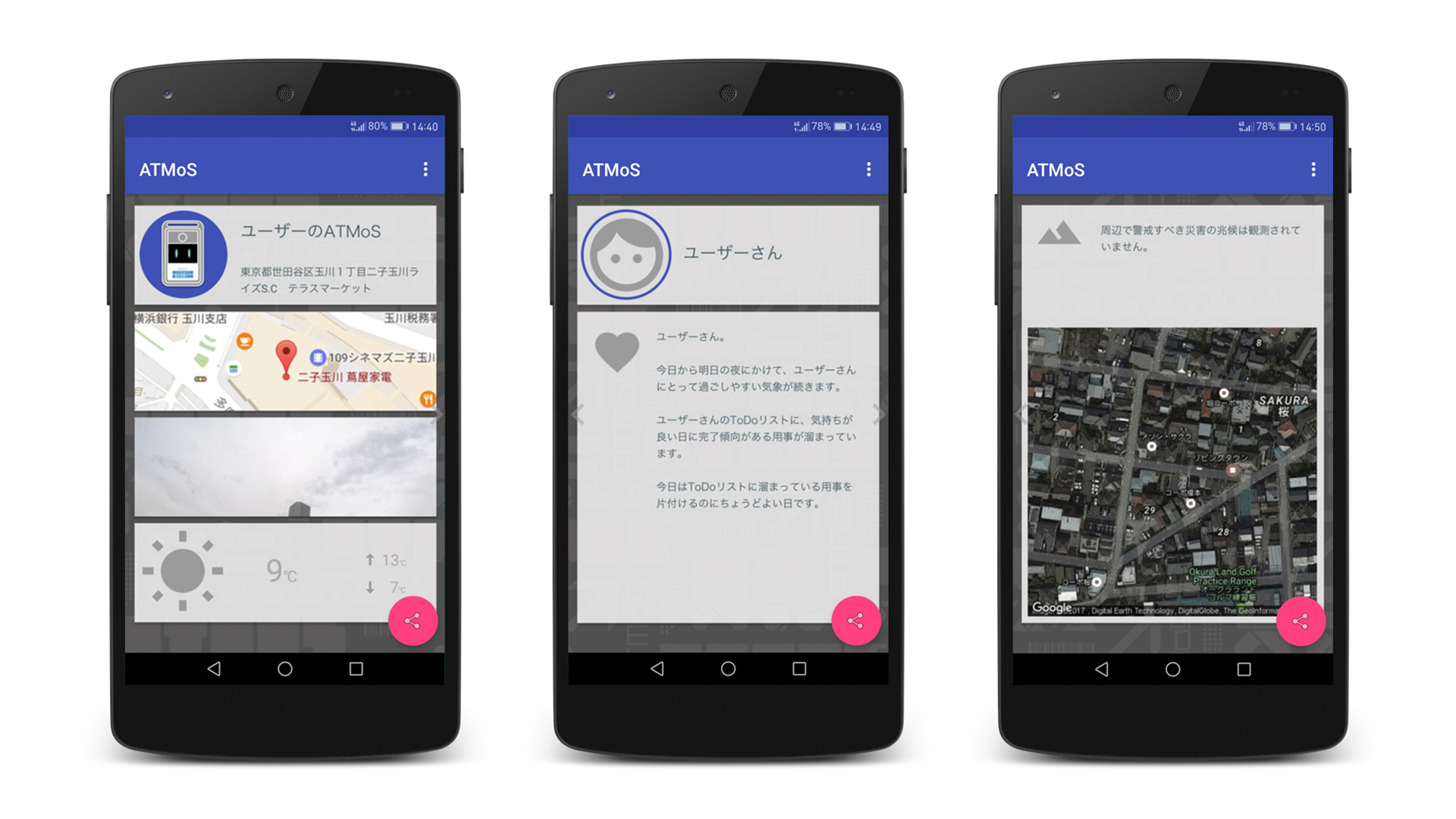 ATMoSは、様々なセンサーを搭載しており、ユーザーの行動や周りの情景、行動地域の気象状況を詳細に観察・監視します。
