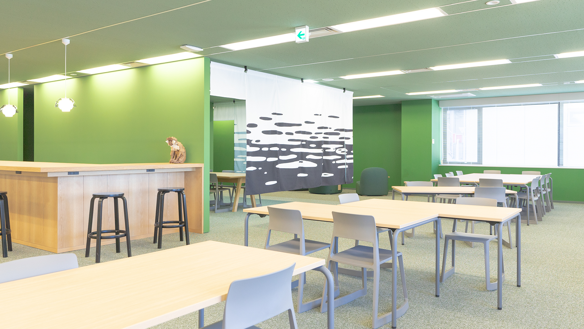 また、壁の代わりに特注の巨大のれんを配することで、空間を緩やかに接続し、人同士の出会いや空間の広がりを助けています。