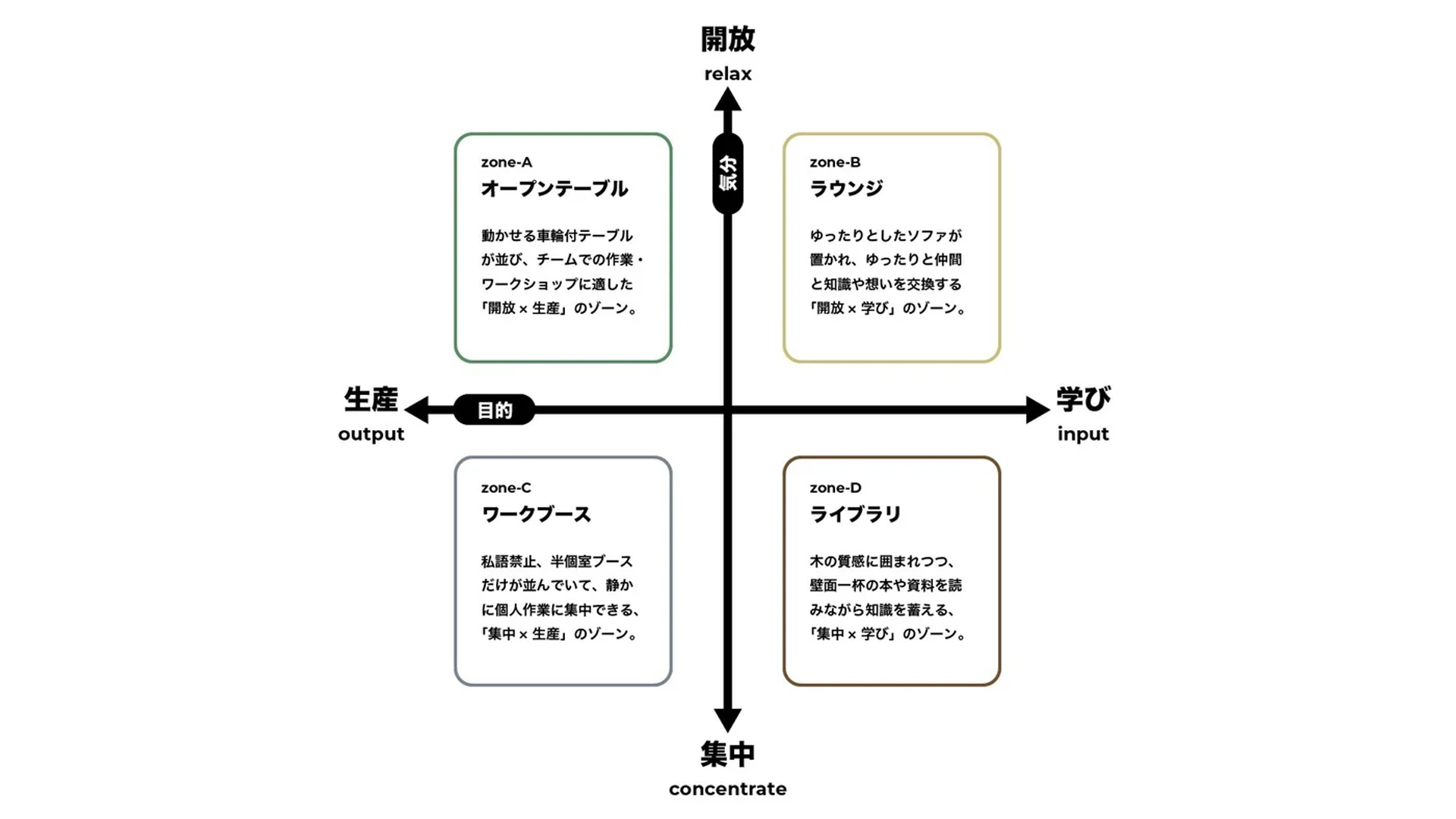 異なる「モード」に最適化された4つのゾーンが共存し、かつ緩やかにつながる空間とすることで、さまざまな「モード」に対応できるオフィスデザイン を目指しました。